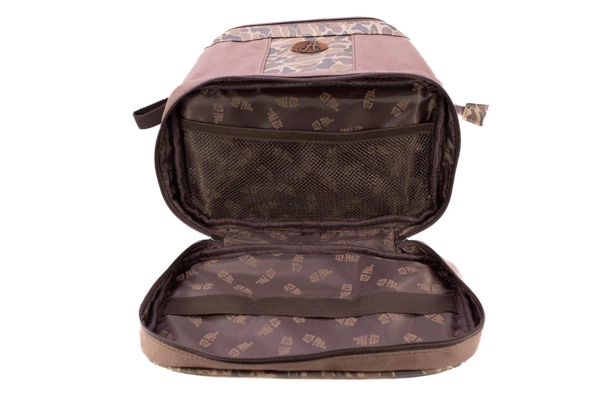 Show your Alabama Crimson Tide pride with an original Zep-Pro Old School Camo wide mouth toiletry bag. This bag is popular among college students and alumni. It is a stylish and unique way to show enthusiasm while keeping toiletries secure and organized. The bag is constructed of soft and sturdy waxed canvas trimmed with camo PU. An accented antique copper emblem is proudly displayed on the front.