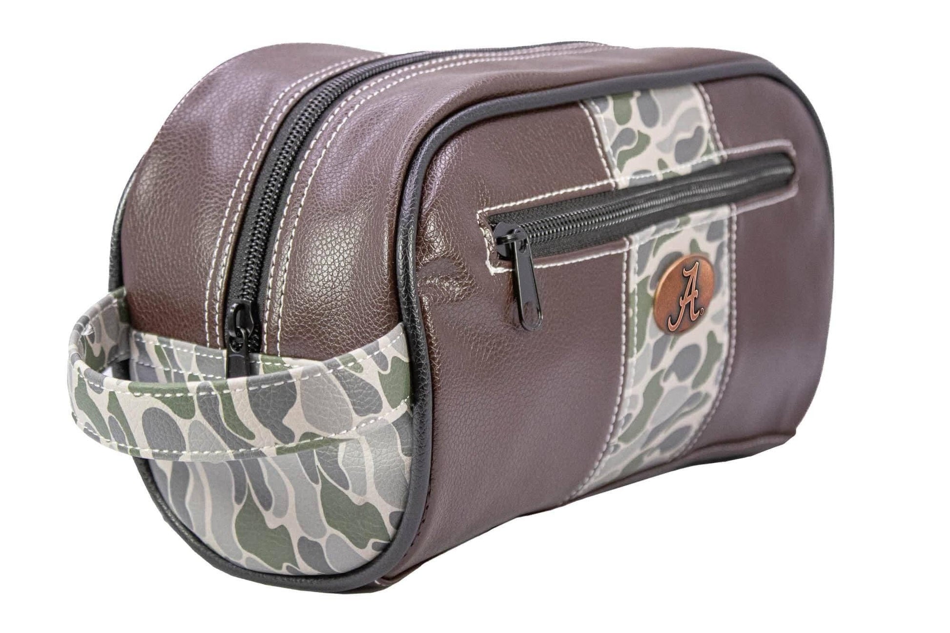 Show your Alabama Crimson Tide pride with an original Zep-Pro Old School Camo toiletry bag. It is a stylish and unique way to show enthusiasm while keeping toiletries secure and organized. This Zep-Pro toiletry bag is constructed of soft and sturdy pebble grain PU. An accented antique copper emblem proudly displayed on the front. This bag is designed to be versatile for various purposes, including short trips, weekend getaways or placed inside carry-on luggage. Additionally, the combination of the old school camo print, along with the brown pebble grain texture, creates a visually stylish item. This bag represents not only a functional item but also a connection to nature. The dopp kit is a great gift with a multifaceted appeal. Whether it’s for graduation, birthday, or other special occasion, this bag will be appreciated for years to come. A must-have travel accessory for all fans !