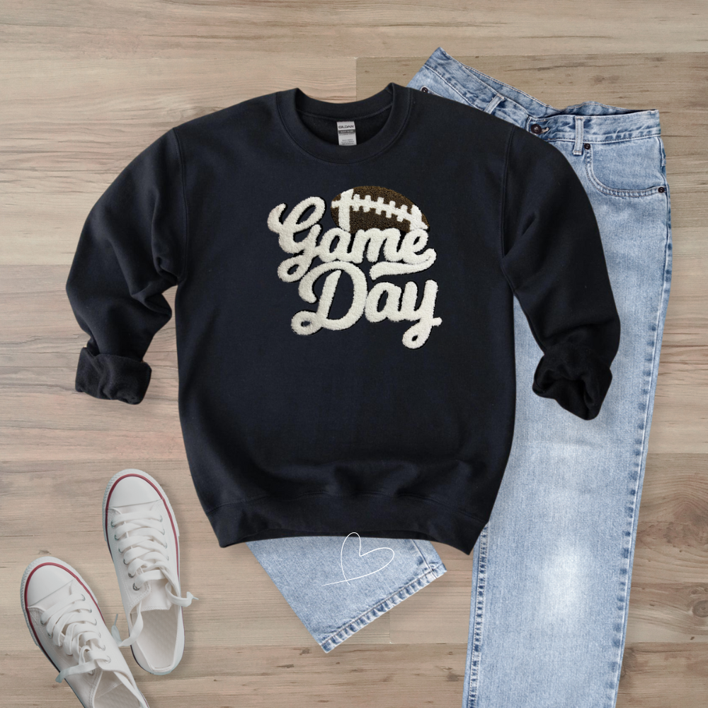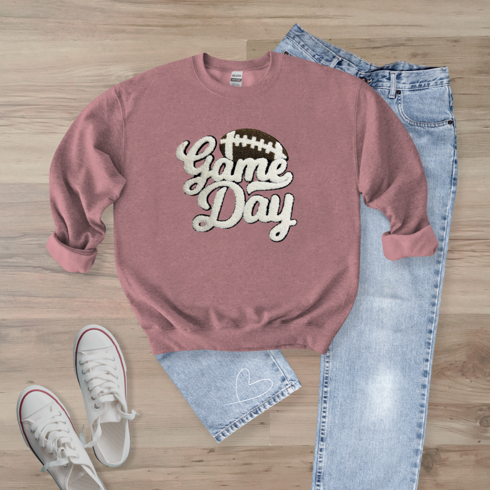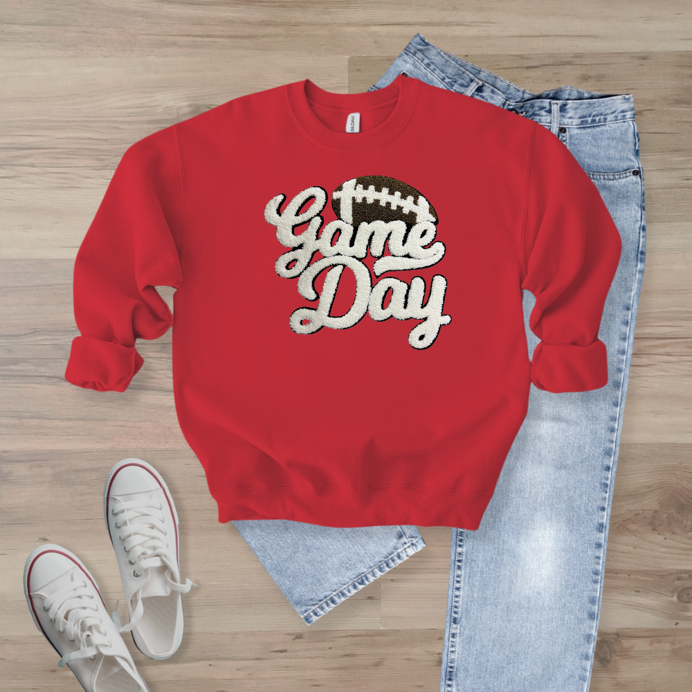 Game Day WHITE Football Chenille Patch Unisex Gildan 18000 Sweatshirt (Copy)