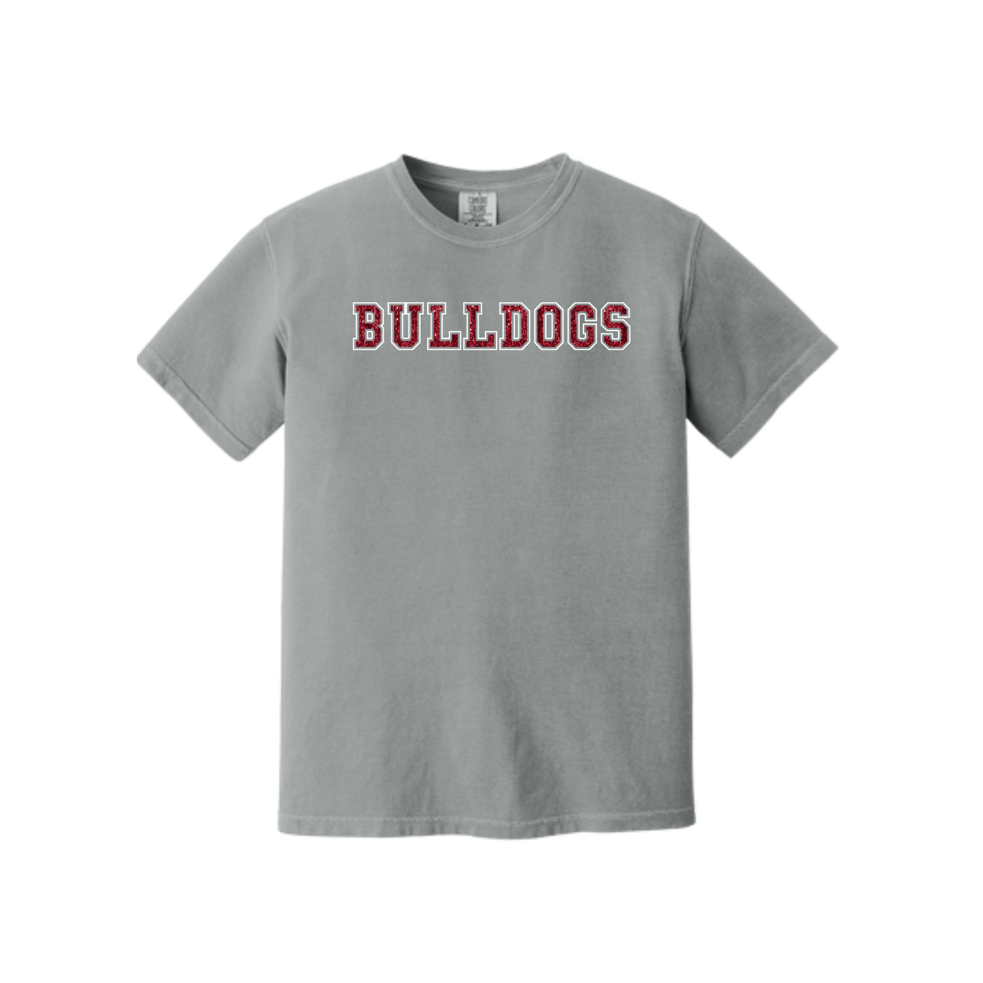 Rep your team in style with this classic and comfy BULLDOGS tee! Printed on a soft, garment-dyed Comfort Colors t-shirt, this top features a Varsity Maroon glitter font that pops against the any background. Perfect for game days, spirit wear, or everyday casual looks.