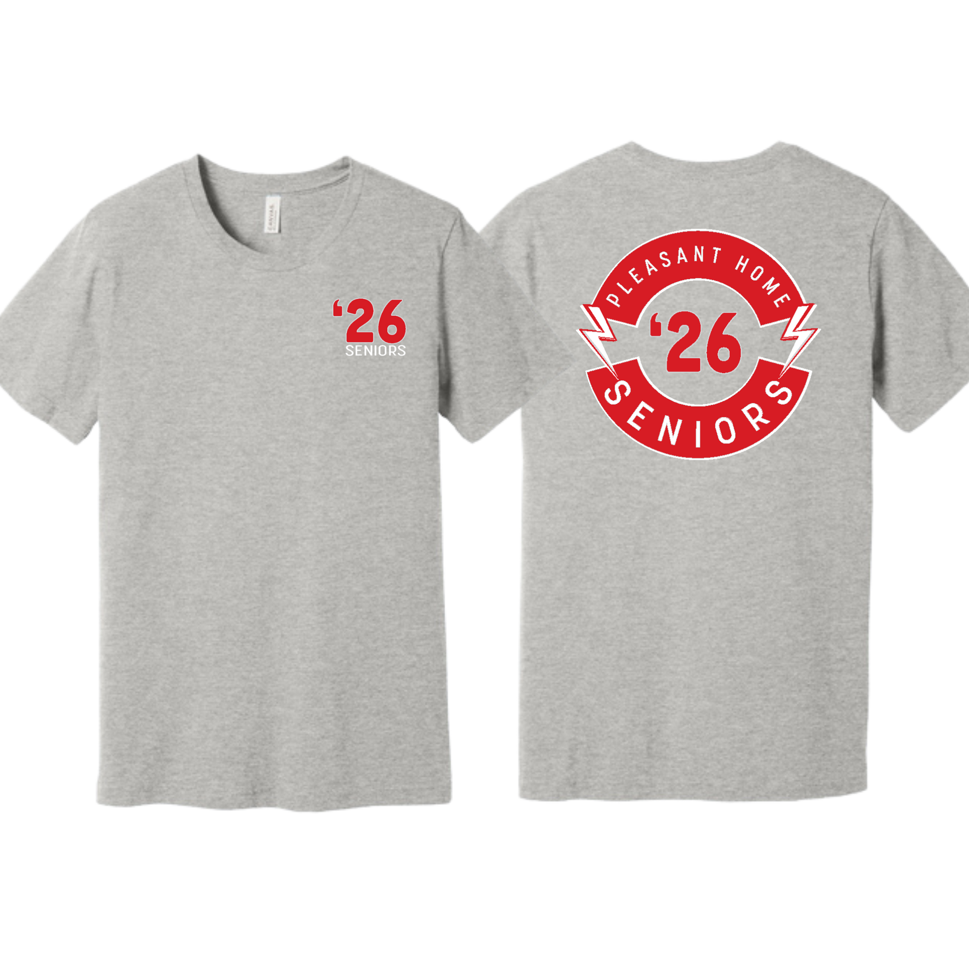 Celebrate the Class of 2026 in style with this athletic gray Bella+Canvas tee, designed for PHS seniors who want to rep their school with pride. The front features a clean left-chest graphic with a bold red '26 SENIORS stamp, while the back showcases a standout circular emblem with “PLEASANT HOME” arched above and “SENIORS” below, wrapped around a bold ‘26. Made with the soft, high-quality comfort Bella+Canvas is known for, this tee is the perfect combo of school spirit and all-day wearability. Ideal for senior photos, pep rallies, or just making senior year official.